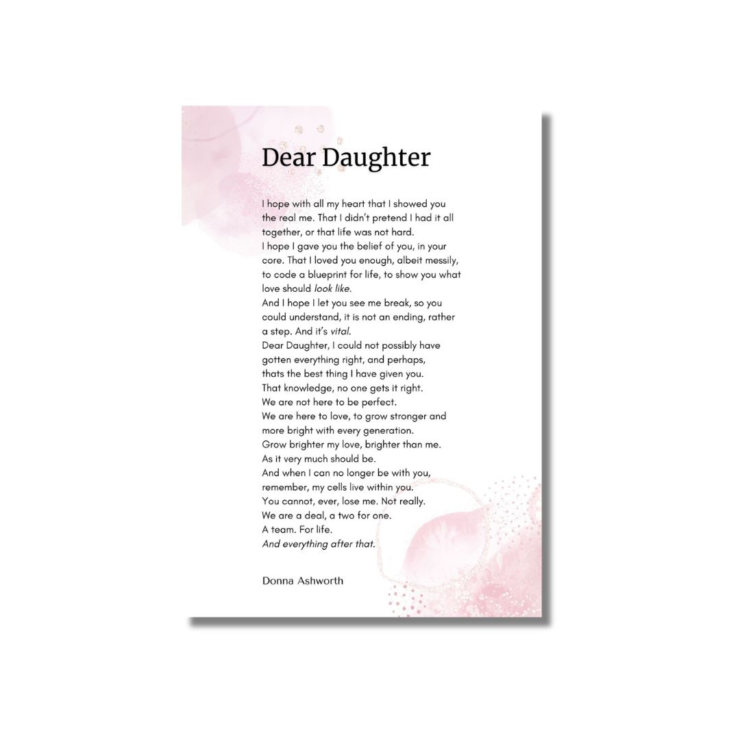 Reads “Dear Daughter I hope with all my heart that I showed you the real me. That I didn’t pretend I had it all together, or that life was not hard. I hope I gave you the belief of you, in your core. That I loved you enough, albeit messily, to code a blueprint for life, to show you what love should look like. And I hope I let you see me break, so you could understand, it is not an ending, rather a step. And it’s vitalDear Daughter, I could not possibly have gotten everything right, and perhaps, thats the best thing I have given you. That knowledge, no one gets it right. We are not here to be perfect. We are here to love, to grow stronger and more bright with every generation. Grow brighter my love, brighter than me. As it very much should be. And when I can no longer be with you, remember, my cells live within you. You cannot, ever, lose me. Not really. We are a deal, a two for one. A team. For life. And everything after that.” Donna Ashworth