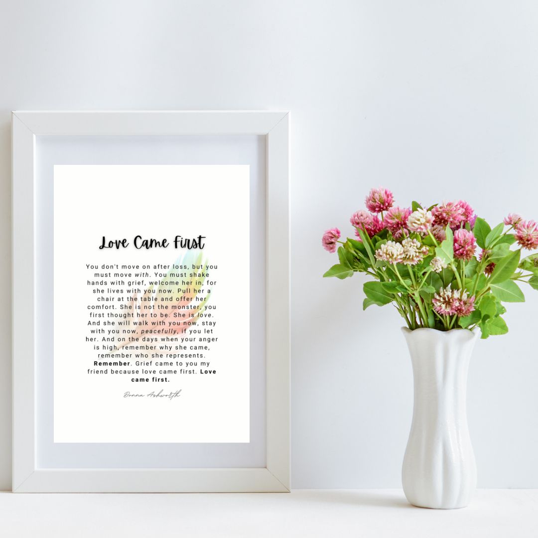 Reads: “Love Came First You don’t move on after loss, but you must move with. You must shake hands with grief, welcome her in, for she lives with you now. Pull her a chair at the table and offer her comfort. She is not the monster, you first thought her to be. She is love. And she will walk with you now, stay with you now, if you let her. And on the days when your anger is high, remember why she came, remember who she represents. Grief came to you my friend because love came first. Love came first.” Donna Ashworth