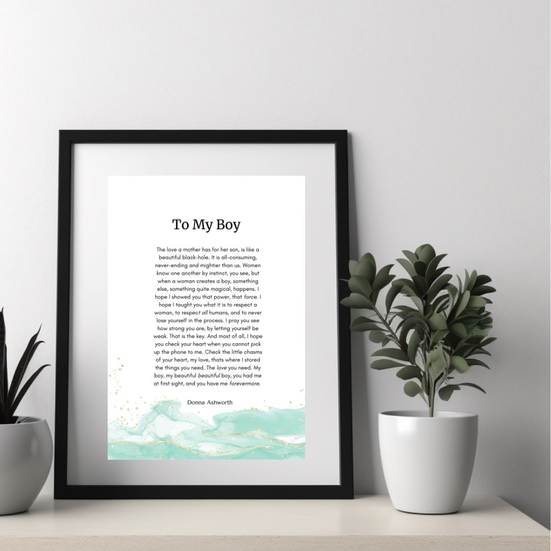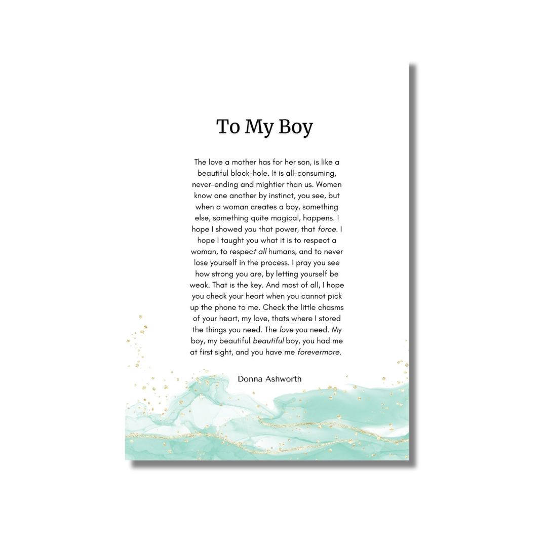 Reads: “To My Boy The love a mother has for her son, is like a beautiful black-hole. It is all-consuming, never-ending and mightier than us. Women know one another by instinct, you see, but when a woman creates a boy, something else, something quite magical, happens. I hope I showed you that power, that I hope I taught you what it is to respect a woman, to respect humans, and to never lose yourself in the process. I pray you see how strong you are, by letting yourself be weak. That is the key. And most of all, I hope you check your heart when you cannot pick up the phone to me. Check the little chasms of your heart, my love, thats where I stored the things you need. The love you need. My boy, my beautiful beautiful boy, you had me at first sight, and you have me forevermore.” Donna Ashworth