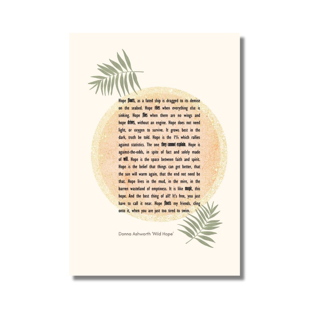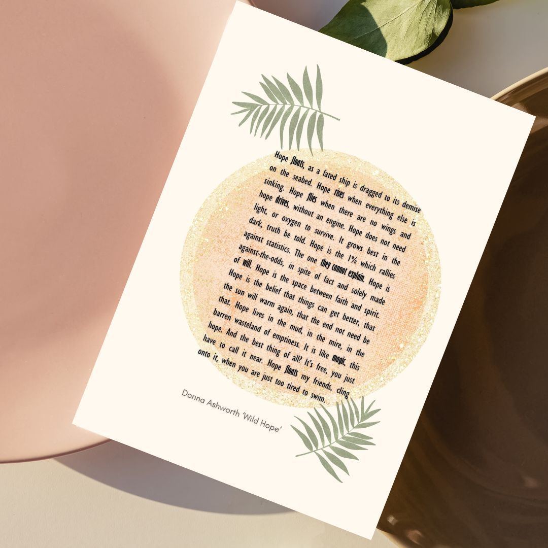 Reads: “Hope floats, as a fated ship is dragged to its demise on the seabed. Hope rises when everything else is sinking. Hope flies when there are no wings and hope, without an engine. Hope does not need light, or oxygen to survive. It grows best in the dark, truth be told. Hope is the 1% which rallies against statistics. The one they cannot explain. Hope is against-the-odds, in spite of fact and solely made of will. Hope is the space between faith and spirit. Hope is the belief that things can get better, that the sun will warm again, that the end not need be that. Hope lives in the mud, in the mire, in the barren wasteland of emptiness. It is like magic, this hope. And the best thing of all? It’s free, you just have to call it near. Hope floats my friends, cling onto it, when you are just too tired to swim.” Donna Ashworth