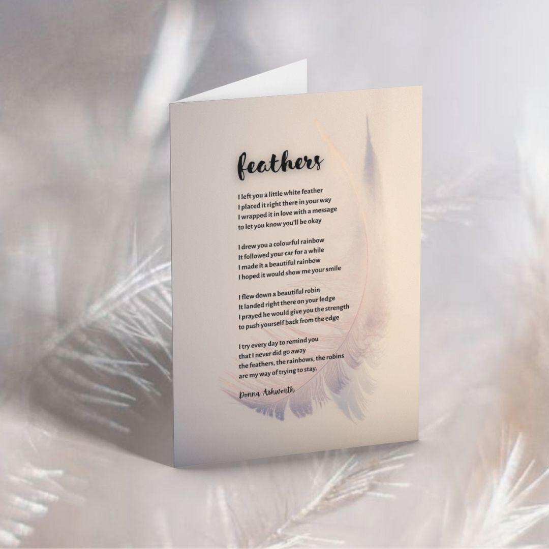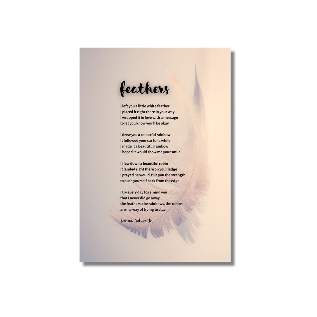 Reads: “Feathers I left you a little white feather I placed it right there in your way I wrapped it in love with a message to let you know you’ll be okay I drew you a colourful rainbow It followed your car for a while I made it a beautiful rainbow I hoped it would show me your smile I flew down a beautiful robin It landed right there on your ledge I prayed he would give you the strength to push yourself back from the edge I try every day to remind you that I never did go away the feathers, the rainbows, the robins are my way of trying to stay. Donna Ashworth”