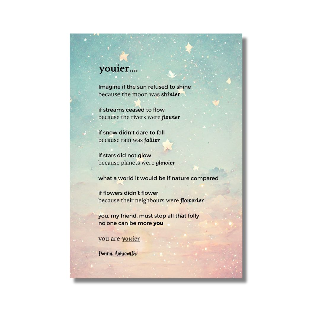 because their neighbours were flowerier you, my friend, must stop all that folly no one can be more you you are youier” Donna Ashworth