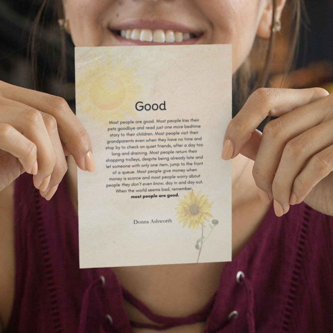 Reads: “Most people are good. Most people kiss their pets goodbye and read just one more bedtime story to their children. Most people visit their grandparents even when they have no time and stop by to check on quiet friends, after a day too long and draining. Most people return their shopping trolleys, despite being already late and let someone with only one item, jump to the front of a queue. Most people give money when money is scarce and most people worry about people they don’t even know, day in and day out. When the world seems bad, remember, most people are good.” Donna Ashworth